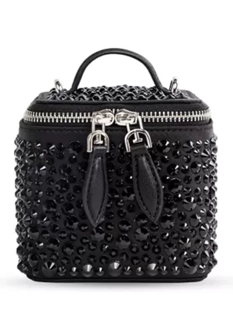 Keep your products with you with this chic vanity case from Sam Edelman, perfect for makeup artists on the go. 18-23" drop removable strap Exterior: bedazzled surfaces, satin, se logo on bottom, se double zip entry, removable and adjustable crossbody strap Interior: se tab Imported Product Specifications 4" × 4" × 4" Material & Care Polyester Clean with a soft cloth