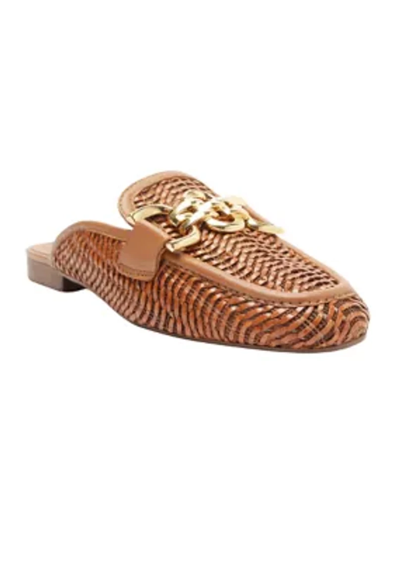 The Evie Mule from Arezzo features an open-back design for effortless slip-on style. Its unique braided upper, adorned with stylish golden chains, adds a touch of luxury to any outfit. Whether you're looking for a comfortable and stylish everyday shoe or a statement piece for your next night out, the Evie Mule is the perfect choice! Slip-on Made in Brazil Imported Product Specifications 0.79" heel Medium width