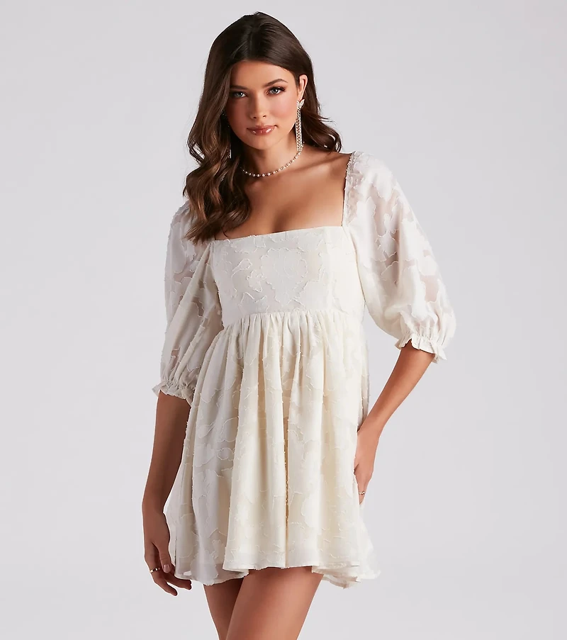 You'll be a darling delight in this short skater dress perfect for parties and ceremonies! It features three-quarter-length puff sleeves, a square neck, a smocked back, and a fit and flare silhouette. The dress is composed of a floral burnout woven fabric with a chiffon lining and no stretch. Style with earrings and a choker to complete the look!