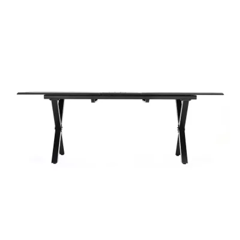 Take advantage of your outdoor space and invite your loved ones over when the weather is nice. Made with a durable aluminum frame, our stunning dining table offers a classic design with a modern upgrade, allowing you to easily match our table with a variety of seating styles of your choice. This piece includes classic slat paneling, x-frame legs, and a convenient umbrella hole, providing your backyard or patio space a sleek and stylish place to enjoy an afternoon barbeque or a hearty evening meal.