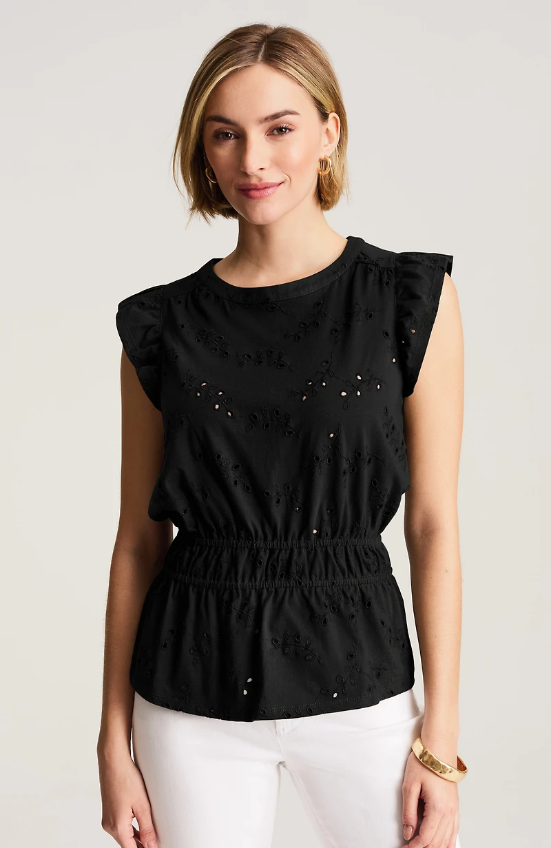 Our eyelet top is all about the details—elastic at the waist shapes the silhouette, shirred shoulders add soft volume, and ruffled accents create playful movement.