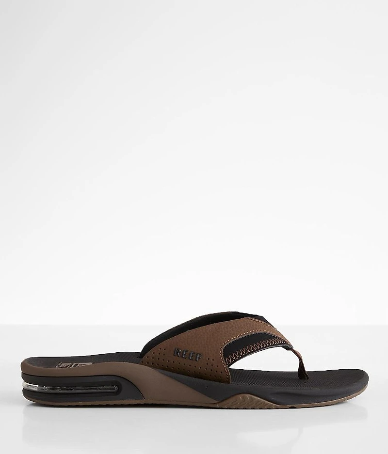 Faux leather strap flip Textured rubber cushioned footbed Bottle opener on bottom