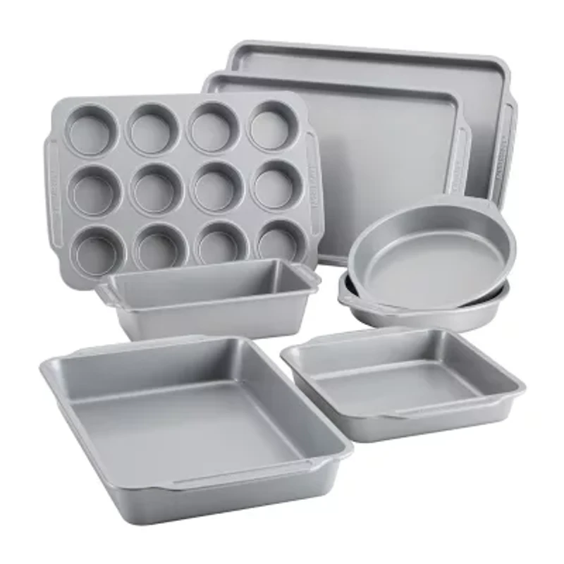 Ready, set, bake and roast, toast, and oven-cook to everyone's delight, with the wide range of essential baking pans in the farberware nonstick bakeware 8-piece set. Farberware has provided over a century of reliability, value, and performance to generations of home bakers. Every sturdy and dependable pan in this bakeware set upholds that tradition. Featuring solid-gauge steel construction, the pans feature rolled rim construction to help resist warping and dinging. And long-lasting nonstick inside and out delivers great food release with quick cleanup. This farberware bakeware set includes an array of essential baking pans for cakes, cookies, muffins, cupcakes, and more. Use the pairs of round and square cake pans to create double-layer cakes, and the rectangular cake pan for sheet cakes, brownies, bars, lasagnas and casseroles. The muffin and cupcake pan is versatile enough to oven-bake mini quiches and savory small bites, and the loaf pan isn't just for breads-it's ideal for entrees like meatloaf and even mac n cheese. Each pan is oven safe to 450 Degree F, and the set is dishwasher safe for quick cleanup, although hand washing is recommended for the best and longest lasting performance. Perfect for sweet treats and savory dishes, the versatile, durable farberware nonstick bakeware 8-piece set makes baking and oven-cooking sweeter for every busy home cook and baker. Set includes: 10-inch x 15-inch and 11-inch x 17-inch cookie pans, two 8-inch round cake pans, 9-inch x 5-inch loaf pan, 9-inch x 13-inch cake pan, 8-inch square cake pan, 12-cup muffin pan.
