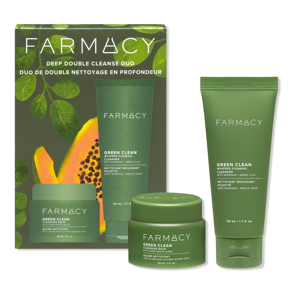 DOUBLE CLEANSING KIT CLASSIC. Benefits: Thoroughly cleanses + removes makeup without stripping. Leaves skin soft + hydrated. Gentle on skin - no scrubbing or irritation. Key Ingredients: Super Greens Blend: promotes healthier-looking skin. Green Clay: absorbs surface oil + buildup. Papaya Extract: helps lift away impurities. Includes: Green Clean Cleansing Balm (1.0 oz). Green Clean Whipped Foaming Cleanser (1.7 oz).