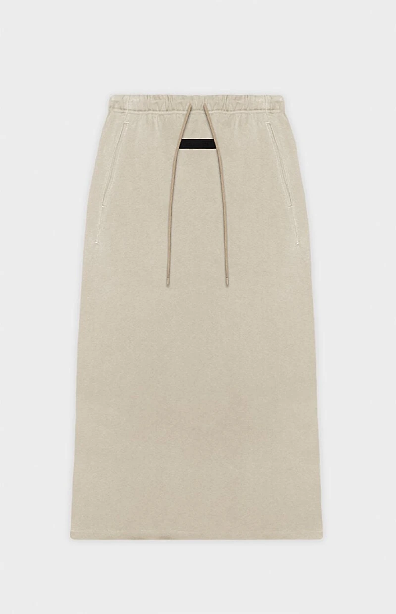 The Fear of God ESSENTIALS Women's Silver Cloud Maxi Skirt features an adjustable drawstring waistband, a rubber brand label at the front, side hand pockets, and a maxi length.