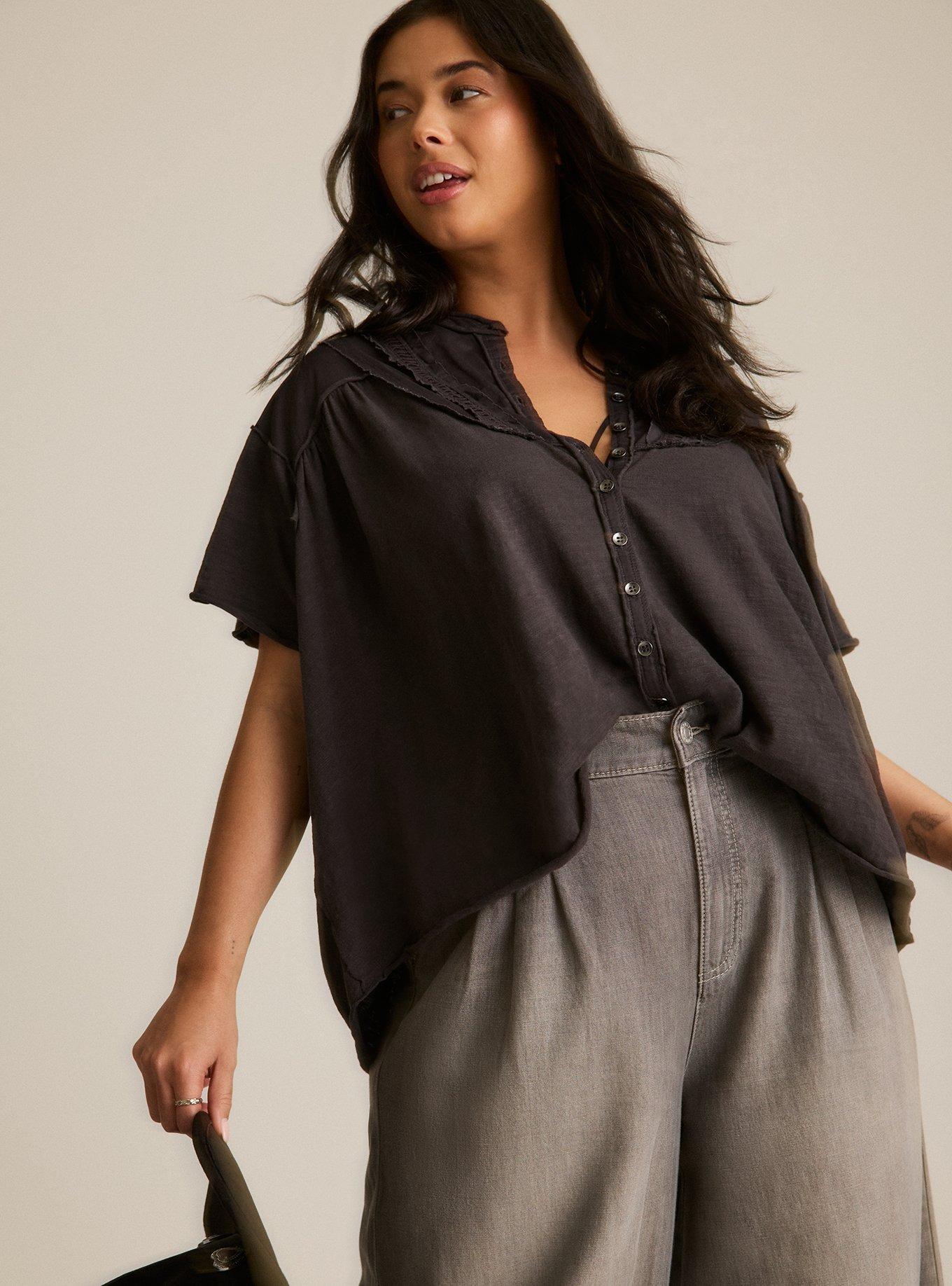 FIT Flowy silhouette. MATERIALS + CARE Slub jersey knit fabric. 100% cotton. Machine wash cold. Tumble dry low. Imported. DETAILS High crew neckline. Short sleeves. Button front. Merrow hem. FESTI Beautiful, evocative pieces for free spirits and the wild at heart. All dreamed up to tell your story. Your next adventure starts here.