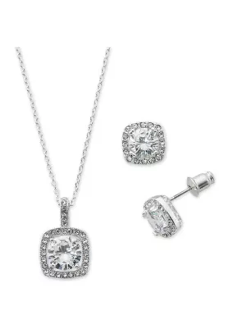 Featuring a pretty pendant necklace and elegant earrings, this set from Belk Silverworks has all you need to effortlessly accessorize any outfit. 2-piece set 48 cubic zirconia stones Post back earring Lobster closure Polished finish Imported Belk Exclusive Product Specifications Necklace: 18" L + 3" extender Earrings: 0.7" x 0.39" Material & Care Surgical steel Silver-tone metal Clean with a soft cloth