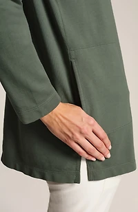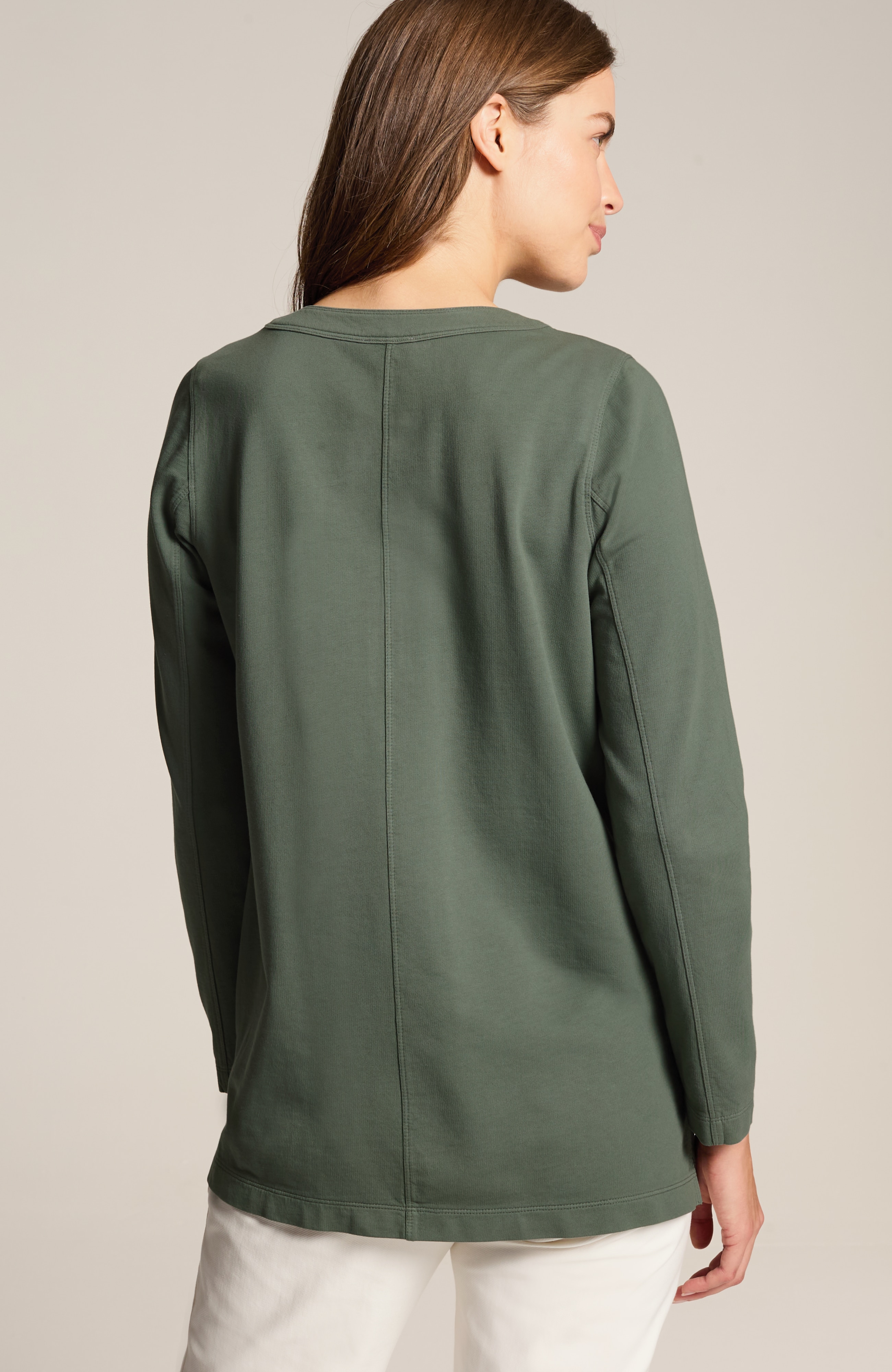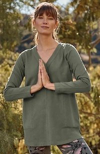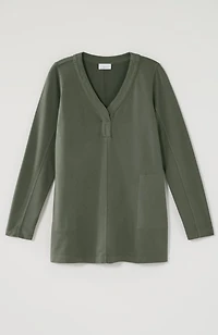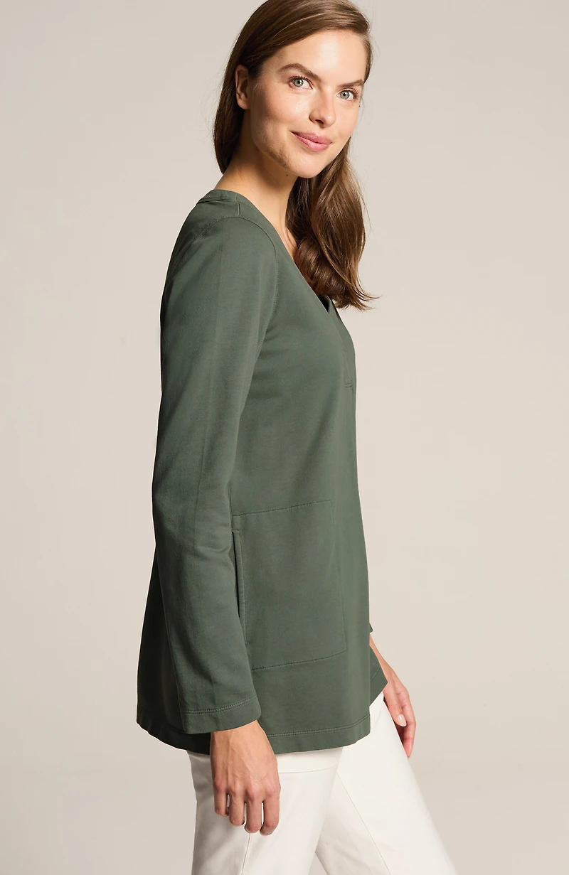 Cozy and cute, our garment-dyed pullover tunic is crafted from supersoft French terry. The longer length offers more coverage to keep up with your every move. Tonal topstitching highlights the V-neckline and the front and back seams. On-seam pockets. Side vents.