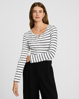 A soft fitted ribbed tee with a classic striped print, long sleeves, and a henley neckline.