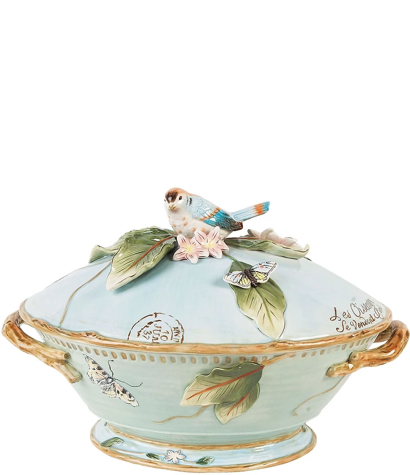 From the Toulouse Collection by Fitz and Floyd, this soup tureen with ladle features:  Take a look into nature's sketchbook at the Toulouse Collection featuring soft muted shades of blues, greens, and taupes with a hand-thrown textured look of solid color pottery with spontaneous glaze and debossing. Inspired from preserving nature's gifts of a friendly garden with songbirds and butterflies and handwritings from old Europe with a feeling of eternal spring, this group will enhance any table. Earthenware Toulouse Collection Delicate floral accent Hand-painted Raised texture Tree branch handles Hand wash recommended Approx. 14.5" L x 10" W x 10" H Capacity approx. 3.5-qt. Imported.