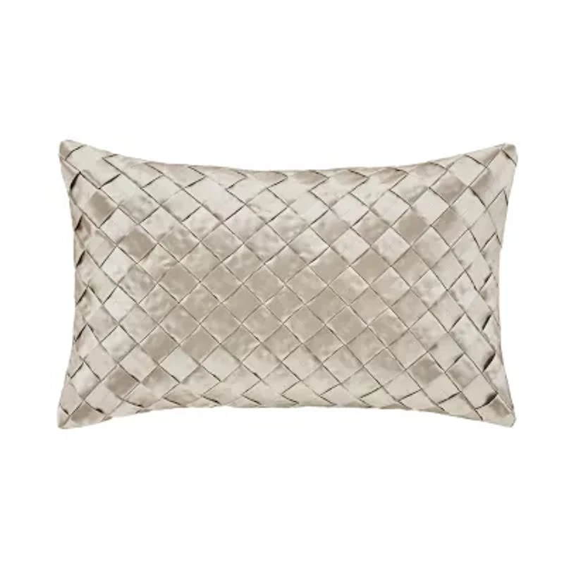 The Dalton Boudoir Pillow is crafted with a solid taupe satin that is braided across the face for a one-of-a-kind look. A highly constructed knife edge trim finishes this luxurious accent piece and is made to coordinate with the Dalton bed set to add timeless elegance to your decor.