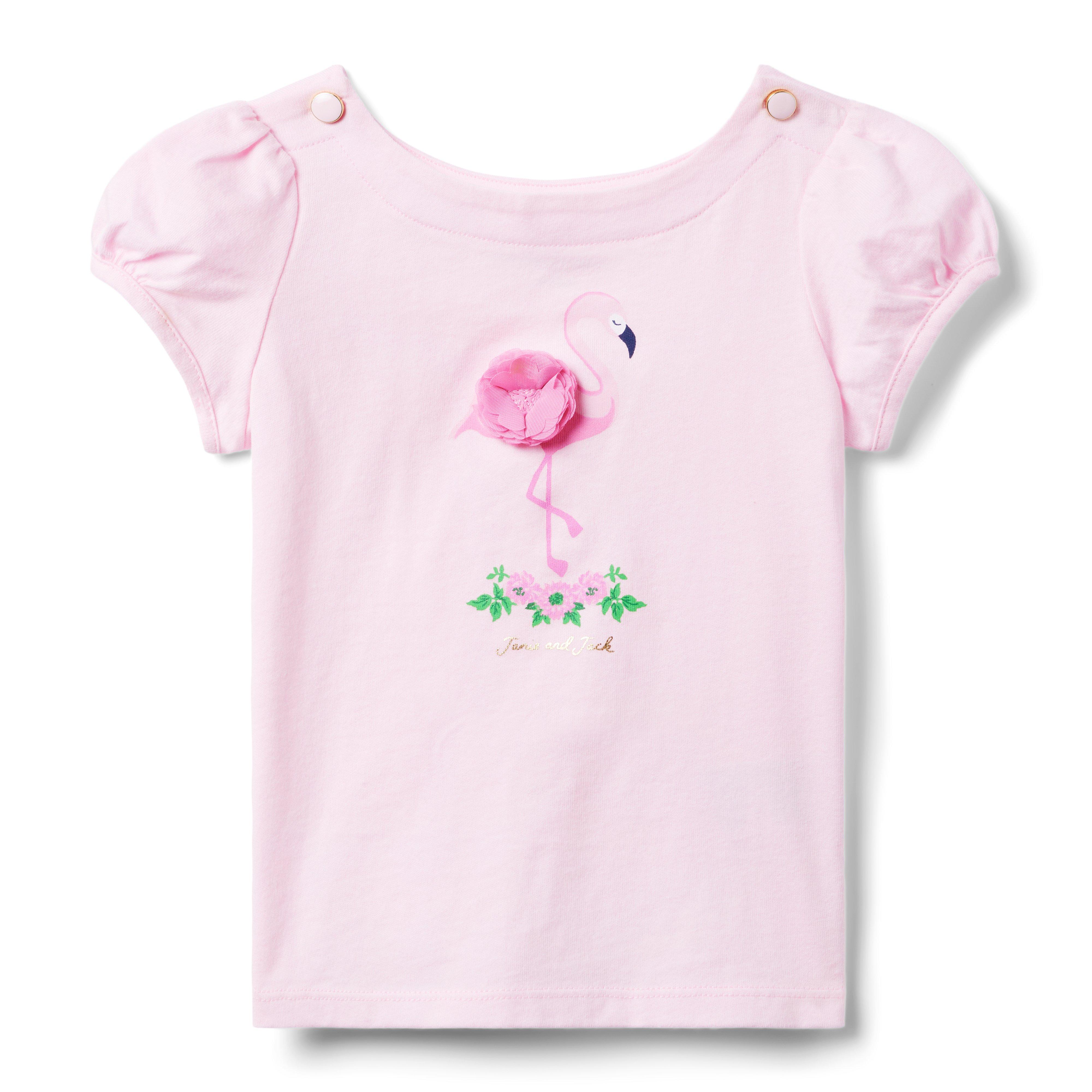 Our soft jersey tee is a standout with a screenprinted flamingo graphic. Plus, little puff sleeves, metallic details and a blooming 3D flower. 100% Cotton Jersey Short Sleeve Buttons At Shoulder Machine Wash, Inside Out; Imported