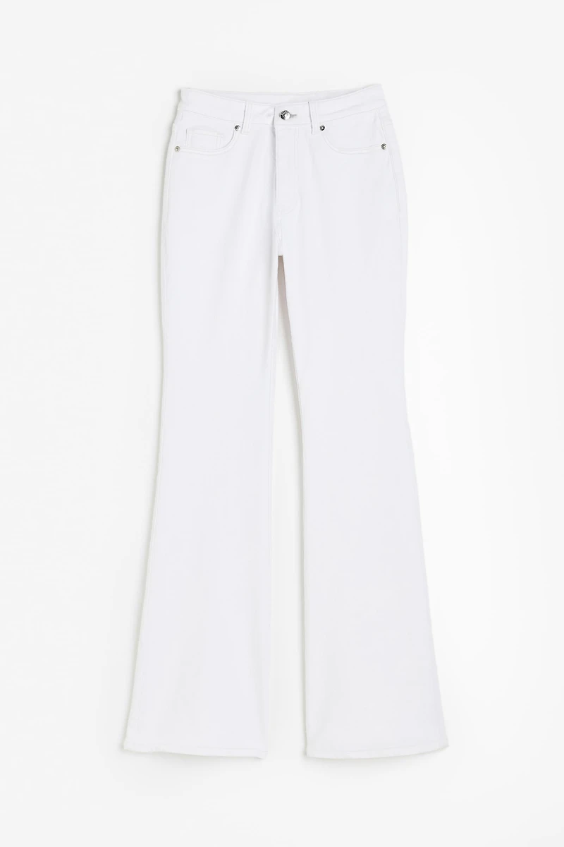 Jeans in denim with gentle stretch. High waist, zip fly with button, and wide, flared hems. Mock front pockets and regular back pockets.