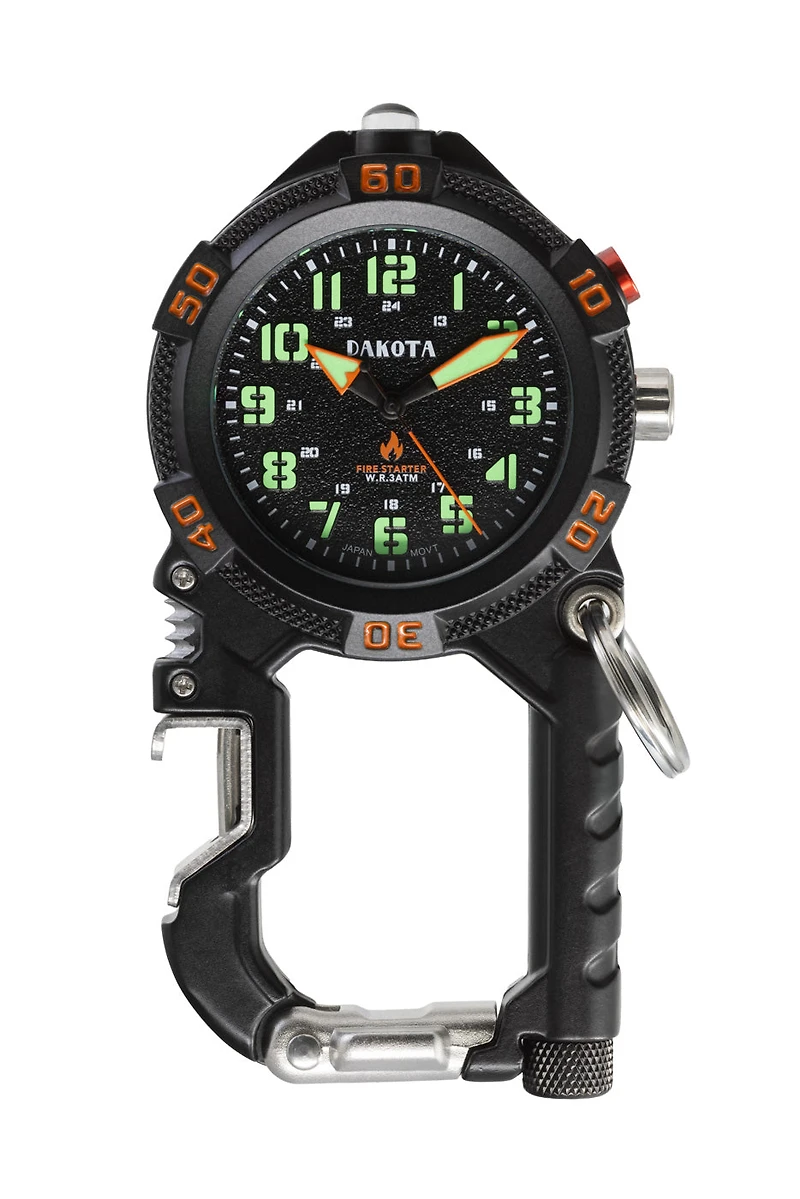 One Clip. Zero Excuses. Stop fumbling through your pack. The Dakota Flint Clip is the ultimate EDC (Everyday Carry) powerhouse designed for those who don't just "go outside"—they conquer it. Ignite Your Adventure: Integrated waterproof flint ensures you’re never without fire, even when the weather turns. Tactical Stealth: A red LED microlight provides visibility without blowing your night vision or giving away your position. Rugged Timekeeping: Housed in a matte black, high-durability carabiner, this watch stays where you need it—off your wrist and out of the way. Mission Ready: From the built-in bottle opener for the summit toast to the waterproof tactical finish, this isn’t just a watch; it’s a survival essential.