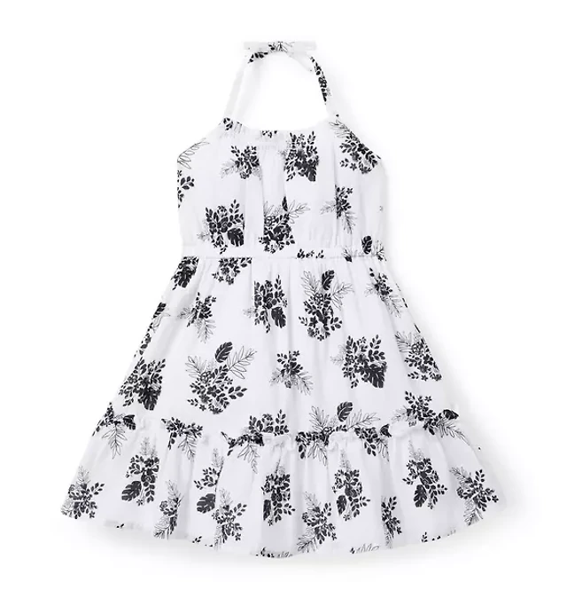 Our floral sundress with a halter neck and ruffle hem is a light and airy pick for sunny days. In pure cotton crinkle gauze perfect for getaways, near and far. 100% Cotton Gauze Fully Lined; Sleeveless Elasticized Waist Button At Halter Above The Knee Length Bloomer Included (Sizes Up To 18-24M) Machine Washable; Imported Now Including Tween Sizes Up To 18
