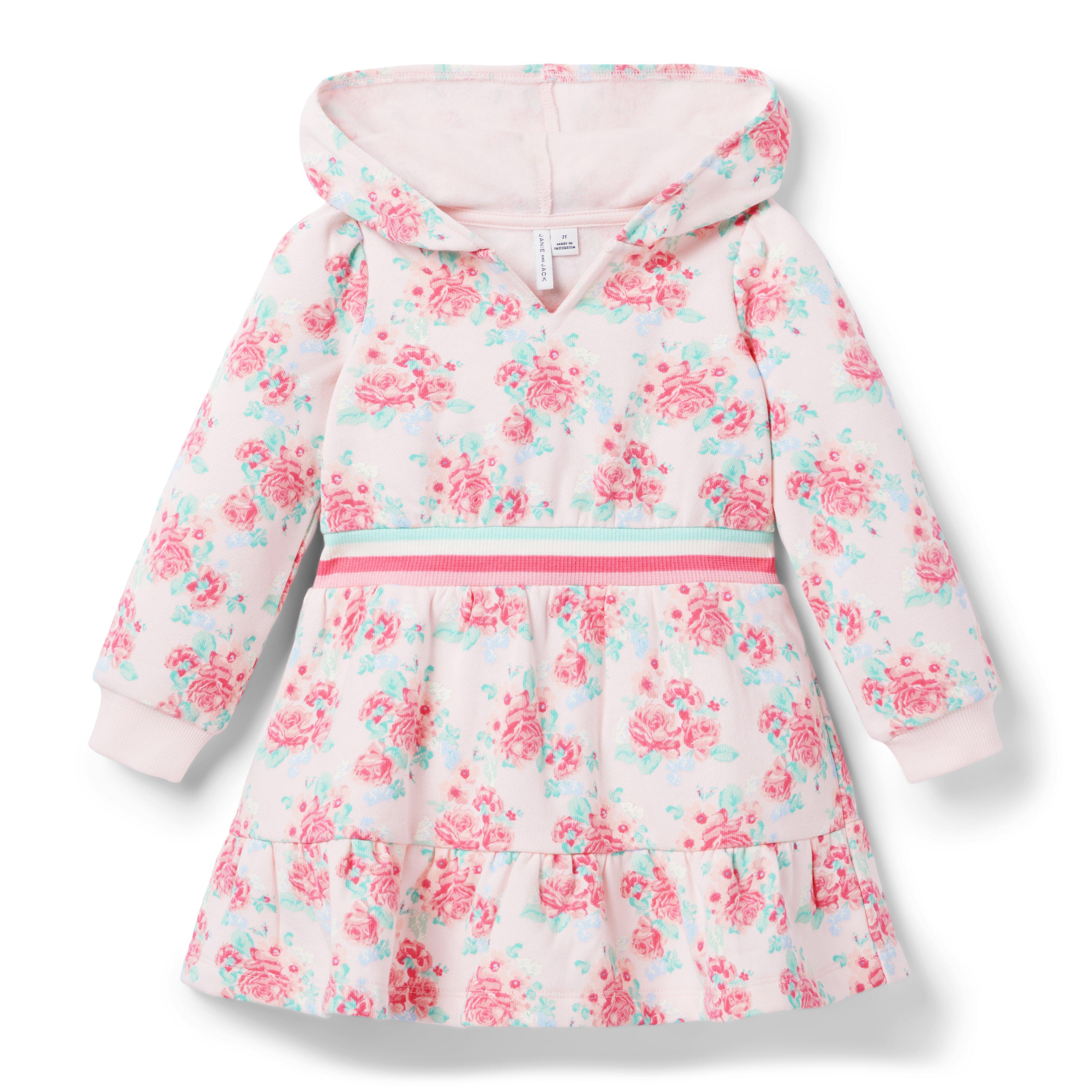 An extra cozy dress we love. Made in soft fleece with allover florals, plus a ruffled hem and a ribbed striped waistband. In a hooded style perfect for wherever the day takes them. 60% Cotton/40% Polyester Fleece; Waistband: 58% Cotton/38% Polyester/4% Spandex Long Sleeve Above The Knee Length Elasticized Waist Bloomer Included (Sizes Up To 18-24M) Machine Washable; Imported