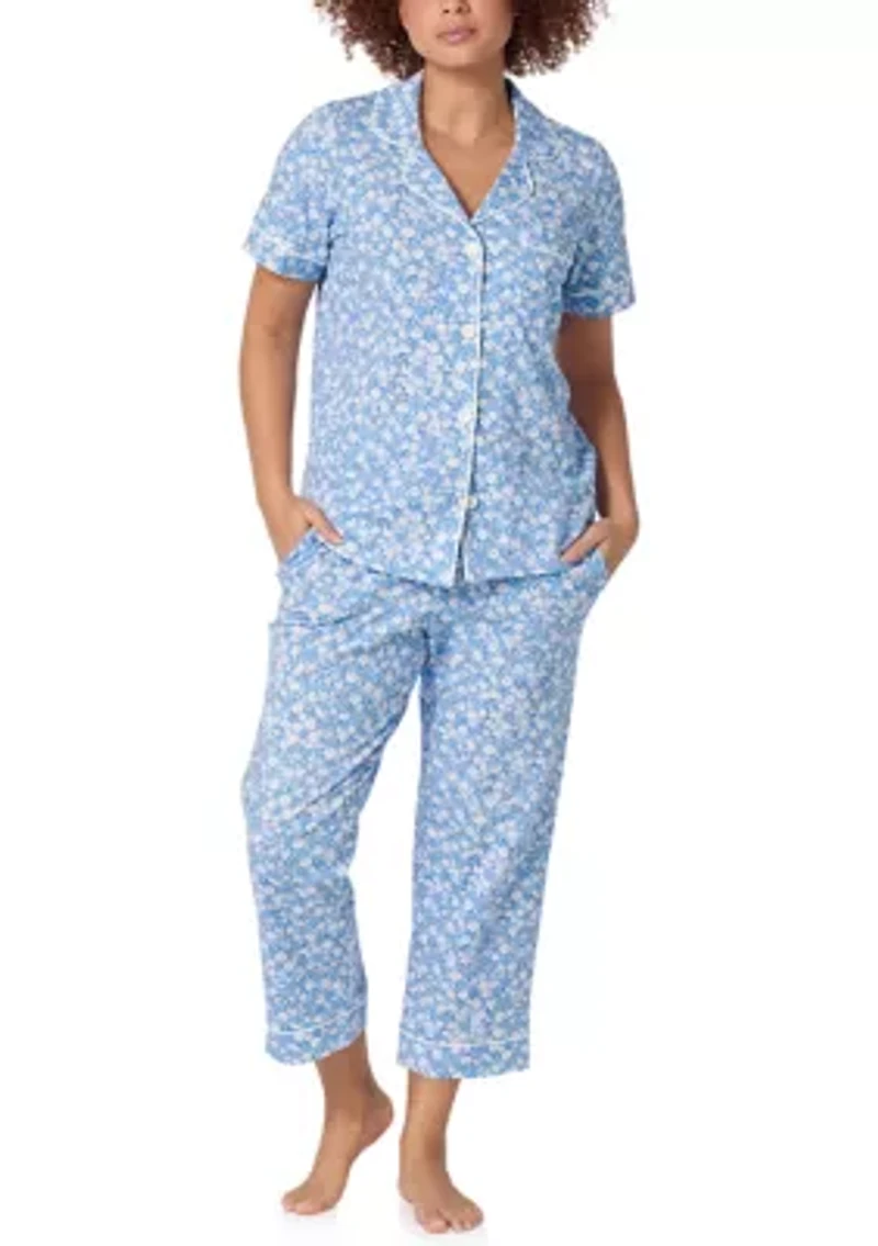 Sleep in style with this pajama set from BedHead PJs. Designed for comfort and ease, this set features a soft, lightweight cotton-blend fabric with a charming floral print for a fresh, feminine look. The cropped pajama pants offer a relaxed fit, perfect for warmer nights or lounging at home, while the matching short-sleeved top completes the coordinated set. 2-piece set Top: button closure, collar, short drop shoulder sleeves Bottoms: elastic waistband Imported Product Specifications Bottoms: 25" inseam, cropped Material & Care Cotton, elastane Machine washable