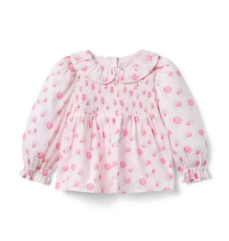 Our pure cotton top blooms with allover florals. In an empire waist silhouette with smocked details, a ruffle collar and ruffle cuffs. 100% Cotton Batiste; Lining: 100% Cotton Fully Lined Long Sleeve Button Back Machine Washable; Imported