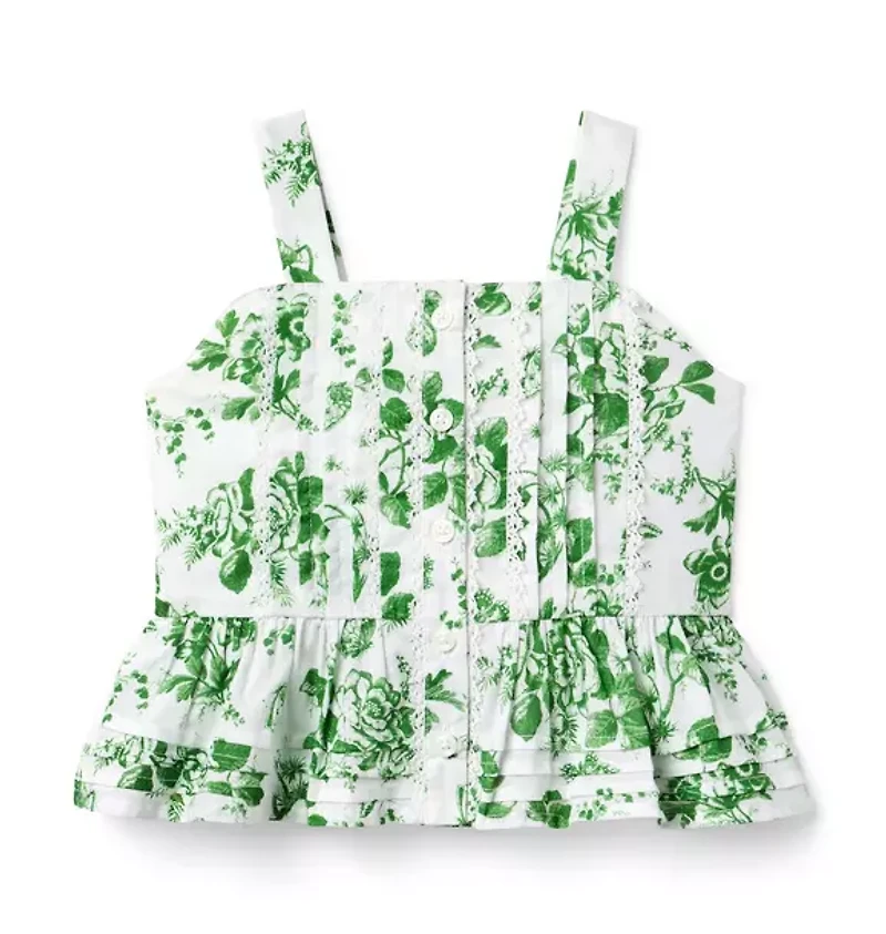 Blooming with allover floral toile, our peplum top is designed in pure cotton with pintuck details and lace trim. 100% Cotton Batiste; Lining: 100% Cotton Fully Lined Sleeveless Button Front Matching Family Styles Available Machine Washable; Imported