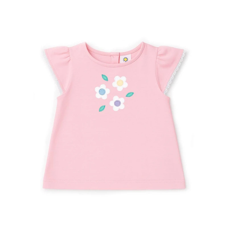 Sweet and sunny, this pink interlock knit top is crafted from soft 100% cotton for cool, all-day comfort. Applique flowers bloom across the front chest, adding cheerful color and playful charm.Flutter sleeves finished with crisp white trim create a light, breezy look, while a back neck button closure keeps dressing simple and polished. A bright warm-weather essential perfect for pairing with shorts, skirts, and days full of sunshine.