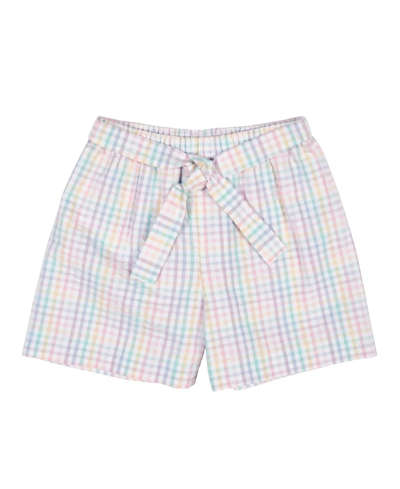 Bright and breezy, these shorts are crafted from multicolor pastel plaid seersucker in soft 100% cotton. A self waist tie adds a sweet finishing touch, while the full elastic waistband ensures an easy, comfortable fit.Lightweight and playful, they re perfect for warm-weather adventures-pair them with our Knit Top with Flowers for sunny days, vacations, and spring celebrations. A cheerful wardrobe staple made for comfort, color, and carefree style.