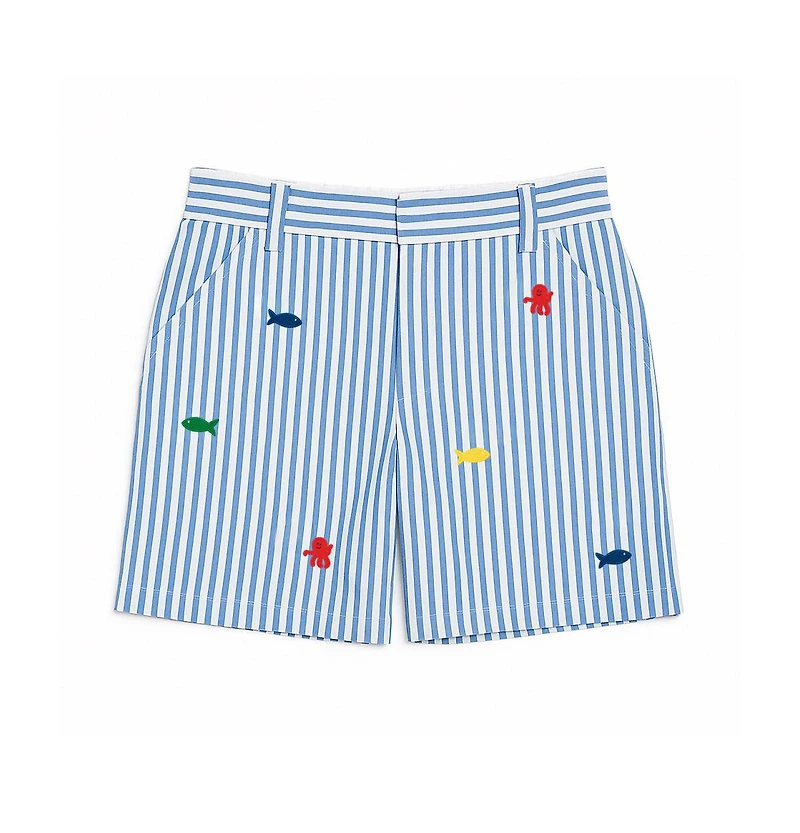 Ready for days of sunshine and play, these royal and white stripe seersucker shorts are crafted from soft 100% cotton. Embroidered fish and an octopus swim across the fabric, adding cheerful, ocean-inspired detail.a pull-on style with a back elastic waistband ensures easy comfort, while front slant pockets, a fake fly, and belt loops lend a polished finish. Perfect for pairing with polos or tees for beach outings, vacation days, and spring adventures.