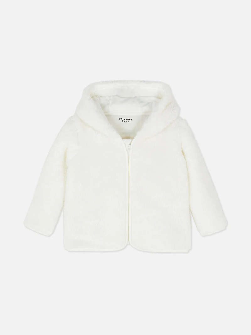 A hooded fluffy jacket with a zip fastening