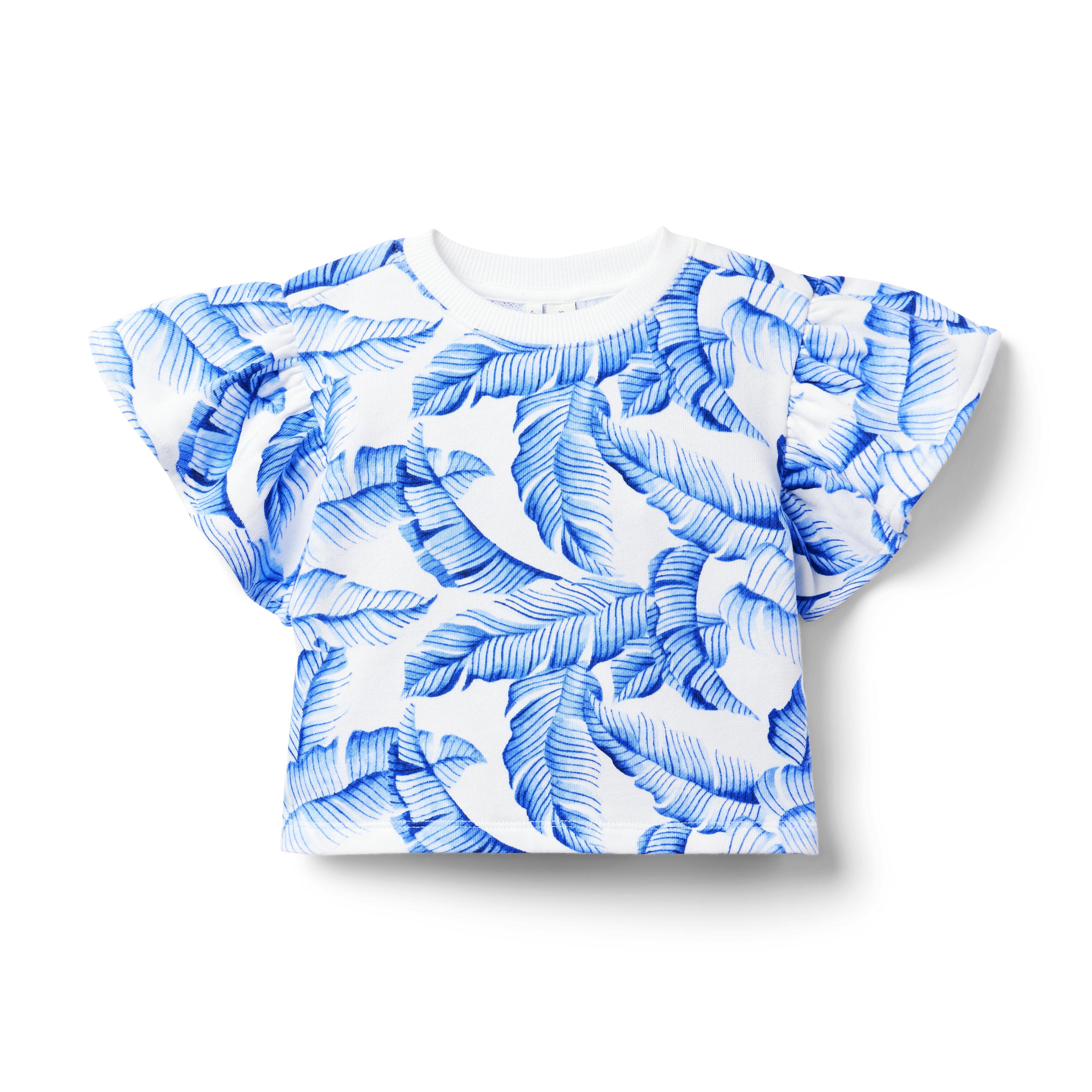 A French terry favorite with a tropical twist. Featuring a tonal palm print and flutter sleeves, in a cropped silhouette we love. Perfect for their next sunny getaway 60% Cotton/40% Polyester French Terry Short Sleeve Cropped Length Matching Family Styles Available Now Including Tween Sizes Up To 18 Machine Washable; Imported