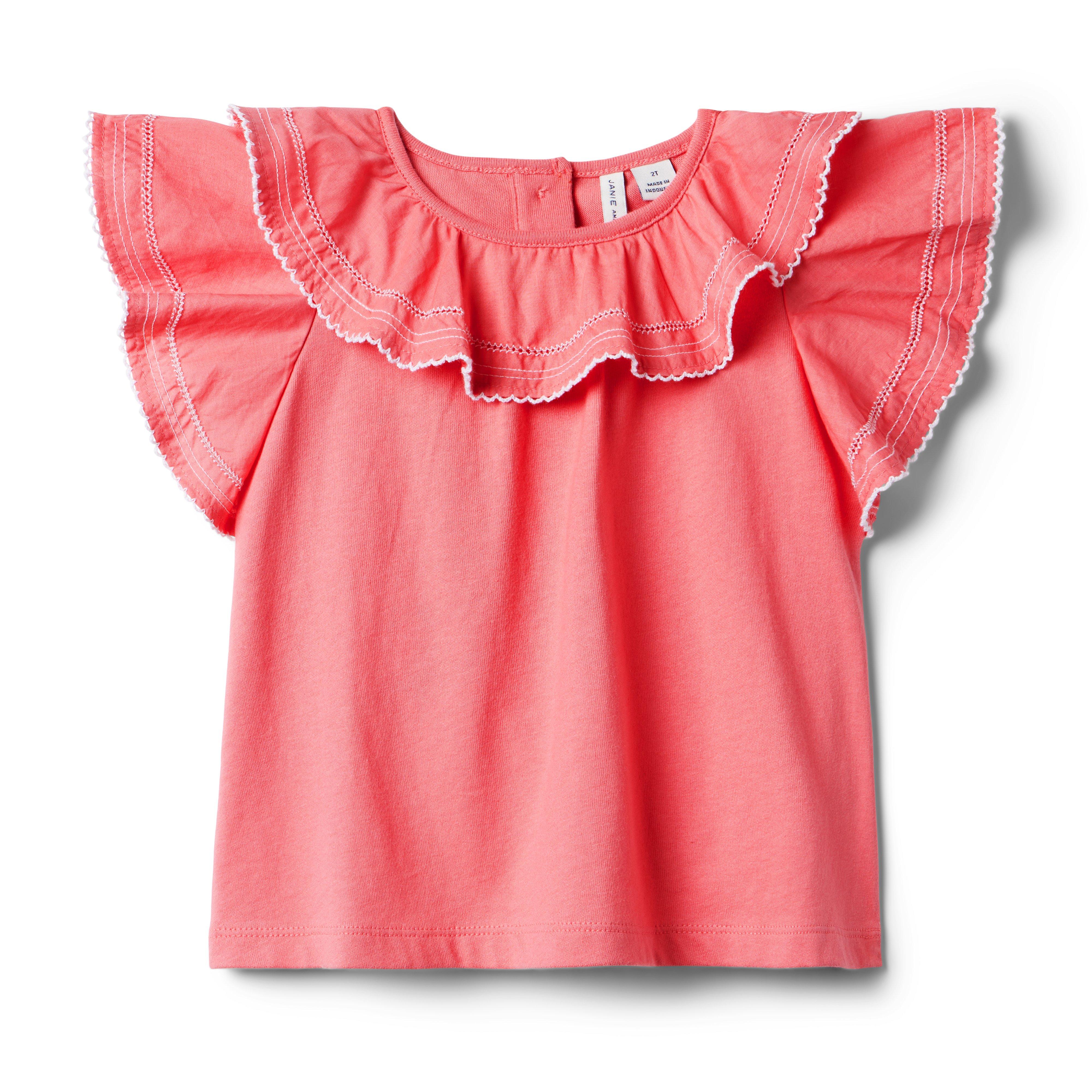 Our soft jersey top is a perfect match for sunny days. With a ruffled collar, flutter sleeves and picot edge detailing for a little something special. 100% Cotton Jersey Short Sleeve Button Back Online Exclusive Machine Washable; Imported