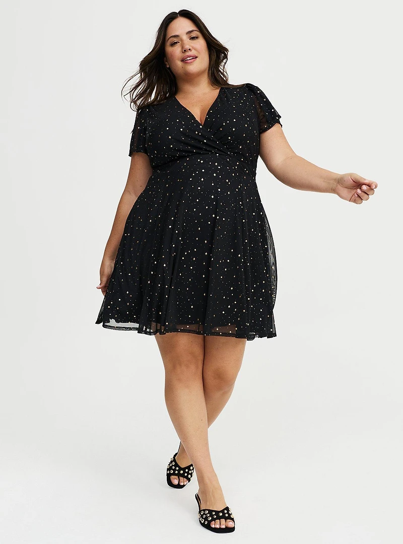 FIT Mini length. Measures 40'' from shoulder (size 2). MATERIALS + CARE Soft mesh knit fabric with foil dots. 95% polyester, 5% spandex. Machine wash cold. Dry flat. Imported. DETAILS V-shaped surplice neckline. Short flutter sleeves. On-seam pockets. Denier-lined bodice & skirt.