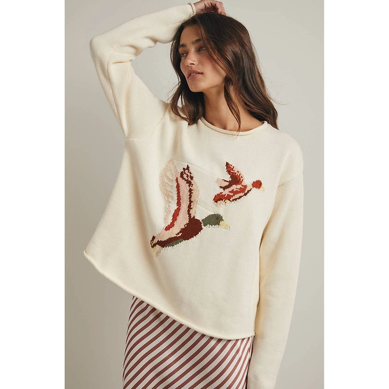 Cozy up in style with this Flying Duck Knit Sweater, featuring a bold retro-inspired duck graphic and soft, breathable fabric