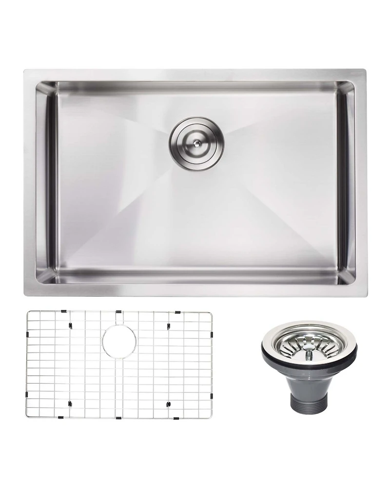 Upgrade your kitchen with this durable 27 inch undermount sink. Made from 18 gauge T304 stainless steel, it features a deep, splash resistant basin, easy drainage, and a protective sink grid. Its scratch and rust resistant design ensures lasting beauty and performance.