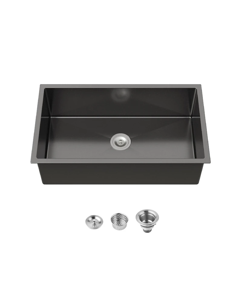 Elevate your kitchen with this sleek 33 inch black sink, expertly crafted from durable 20 gauge 304 stainless steel. Its spacious single bowl, sound absorbing layers, and efficient drain grooves handle all your kitchen tasks. The seamless installation and rounded corners ensure easy cleaning, a quiet environment, and lasting, scratch resistant beauty.