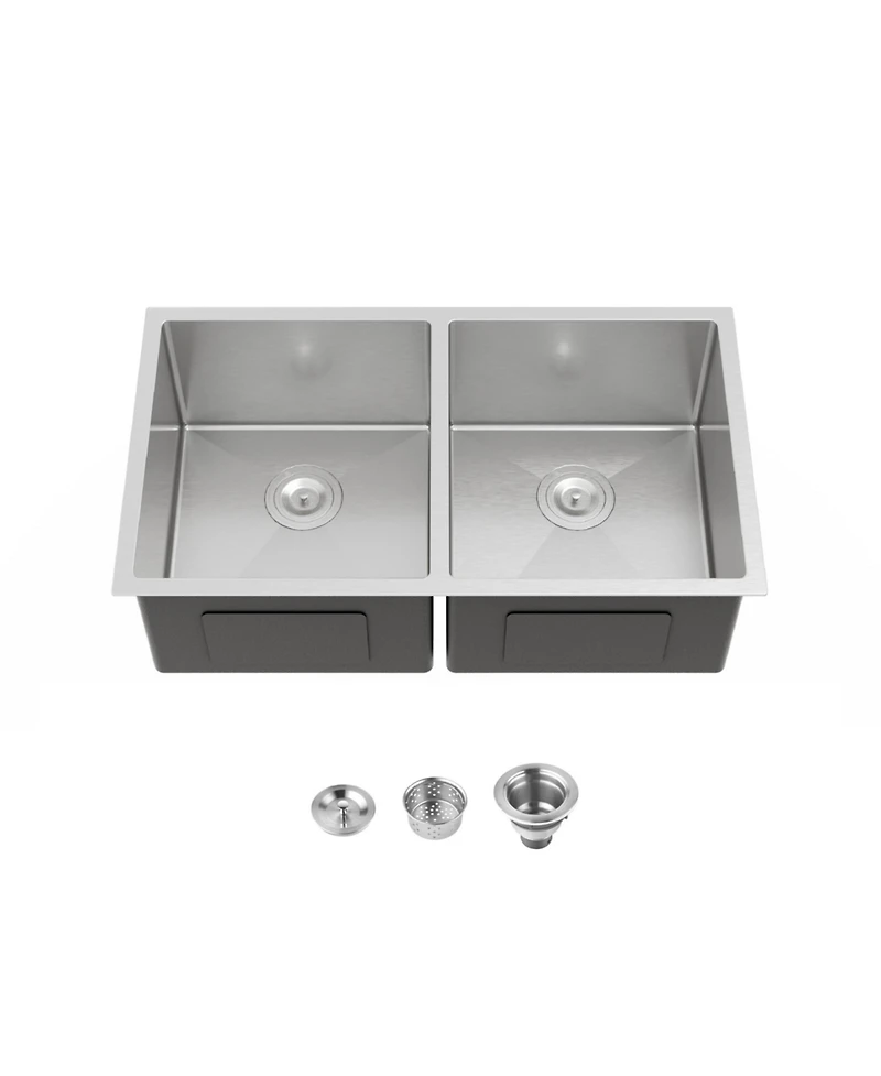 Transform your kitchen with this elegant 33 inch undermount double bowl sink, expertly crafted from durable stainless steel. Its scratch resistant brushed finish, sound absorbing technology, and multi functional design offer a perfect blend of style, quiet performance, and lasting durability.