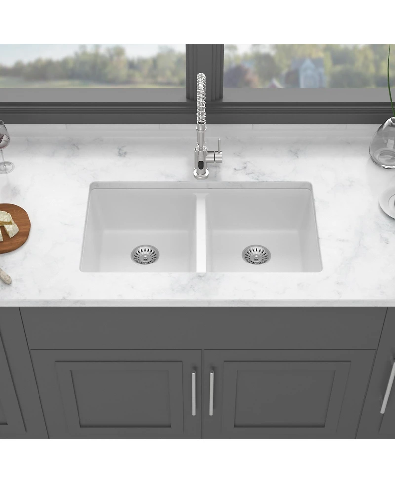 Introduce the elegance and strength of natural stone to your kitchen with this 33 inch white quartz composite double bowl sink Its thick durable construction smooth nonporous surfaces and quiet performance offer a stylish easy to clean and highly functional workspace