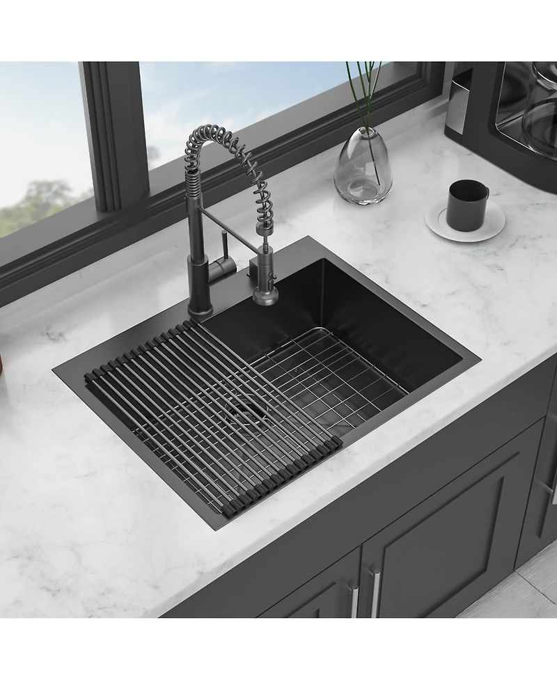 Add a sleek modern touch to your kitchen with this 28 inch gunmetal black drop in sink expertly crafted from 16 gauge stainless steel with nano coating Its deep 10 inch bowl efficient drainage and advanced soundproofing ensure a quiet functional and stylish workspace