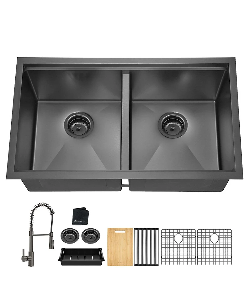 Introduce a complete kitchen solution with this 33 inch gunmetal black undermount double bowl sink expertly crafted from heavy duty 18 gauge stainless steel This all in one set includes a faucet and comprehensive accessories for a durable functional and stylish workspace
