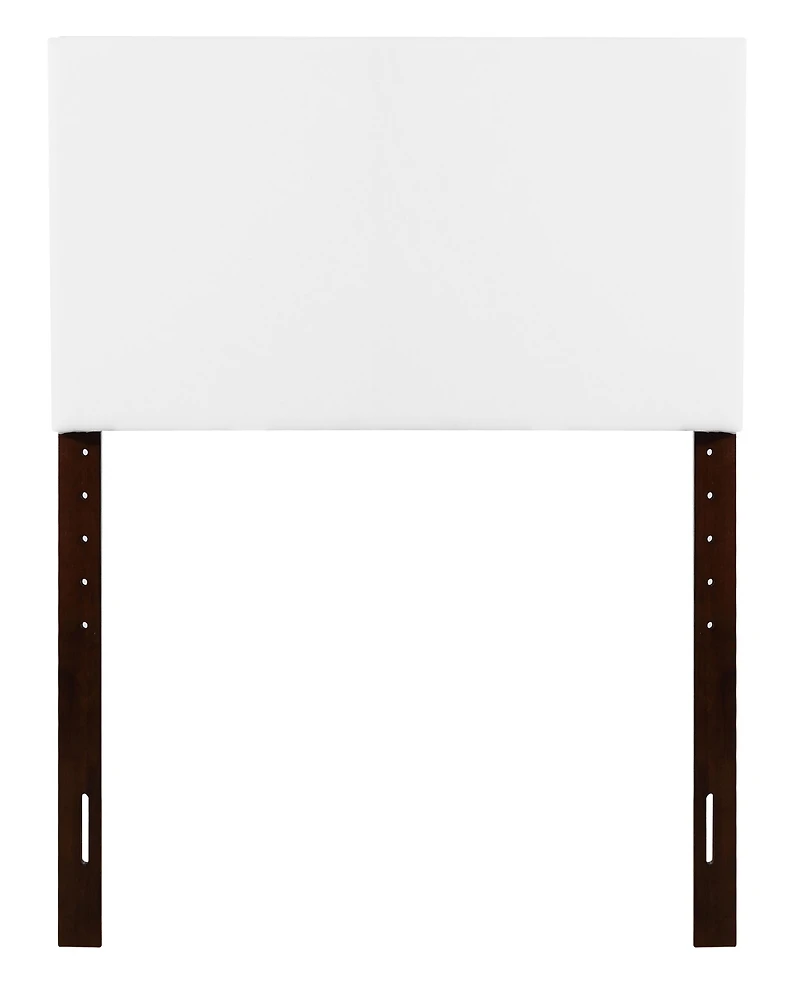 This white twin headboard is covered in easy to maintain faux leather. It has adjustable height from 41 to 53 inch, can be mounted to bed or wall, and is easy to clean.