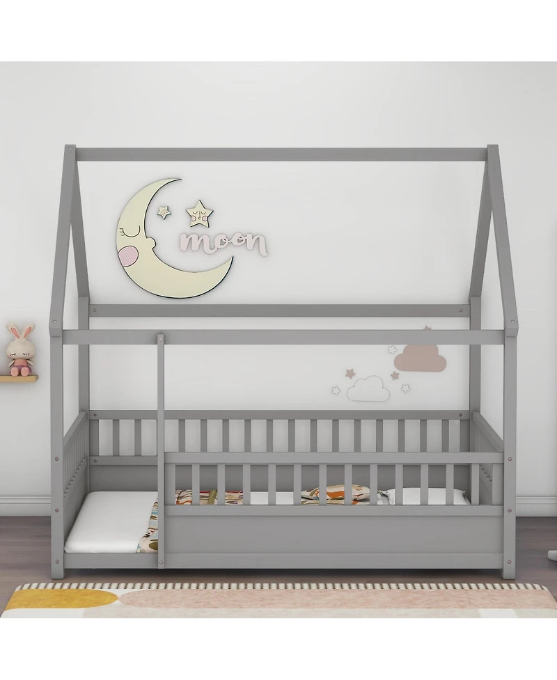 This full size floor bed features wood house roof frame, high safety fence guardrails, made of high grade pine wood, sturdy durable structure, attractive design, easy assembly, perfect for kids spacious safe sleeping and playing area.