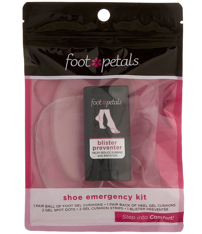 From Foot Petals, the Shoe Emergency Kit features: Includes one pair Ball of Foot Cushions, one pair Back of Heel Cushions, one pair Spot Dot Cushions, one pair Strap Cushions, and one Blister Preventer Anti-Friction Balm Gel ball of foot cushions keep feet from sliding forward, reducing burning pain and preventing calluses; Eliminate ugly overhang and toe scrunch; Help you walk with perfect posture for overall back and leg relief Gel back of heel cushions keep heels from slipping in and out of shoes, giving shoes the perfect fit by helping with sizing and fit issues; Reduce blisters and ankle chaff Gel spot cushions add cushioning to trouble spots in shoes, reducing rubbing and friction, and preventing calluses and blisters Gel strap cushions help to reduce rubbing and keep straps from digging into skin while preventing blisters or marks on the feet and heels Slim designs offer comfort while remaining discreet Blister preventer forms invisible barrier to reduce rubbing and irritation Adhesive backing can be washed with soap and water to restore adhesion, making these cushions reusable from shoe to shoe Imported.