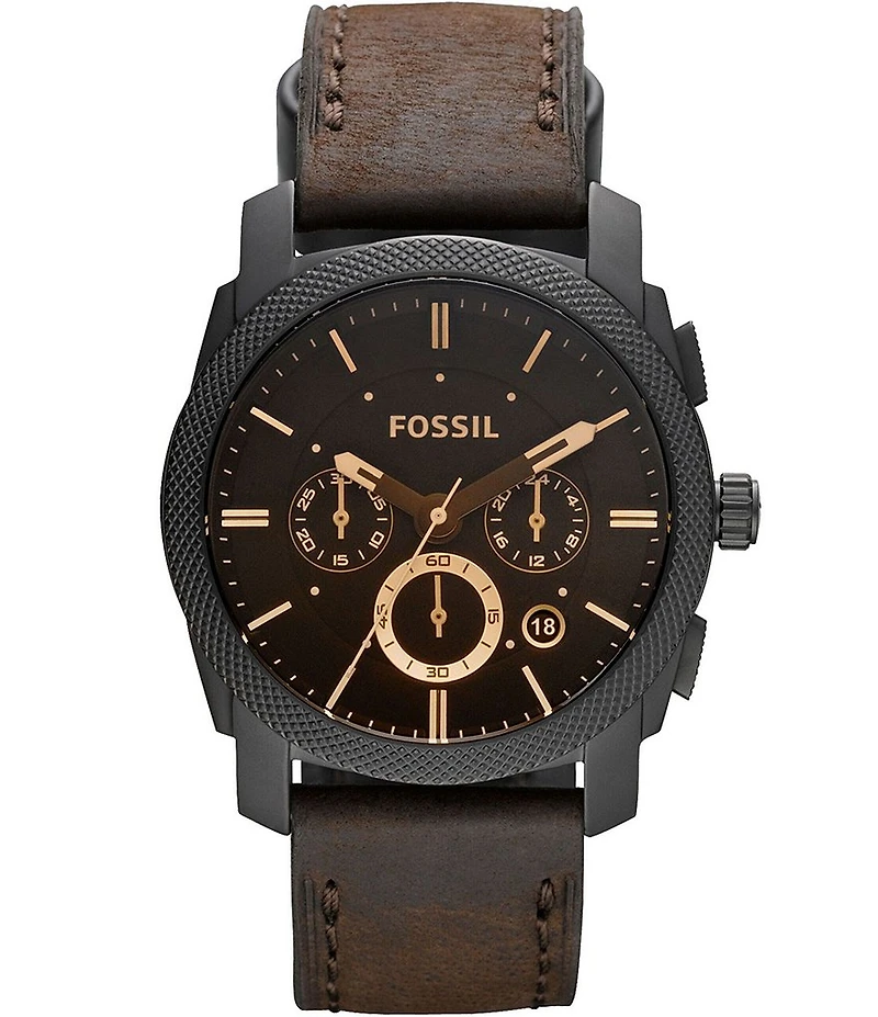 From Fossil, the Machine Mid-Size Chronograph Brown Leather Watch features: Brushed stainless steel black IP case Black dial Brown leather strap buckle closure chronograph movement case size approx. 42mm case thickness approx. 12mm lug width approx. 22mm Inner Circumference: 200 +/- 5mm Water Resistance: 5 ATM Imported.