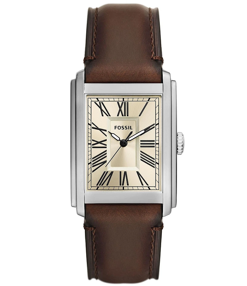 From Fossil, the Men's Carraway Three Hand Brown Leather Watch features: Brown leather strap Cream dial Single prong buckle closure Quartz three-hand movement Band width approx. 22mm Case size approx. 30mm Case thickness approx. 9.4mm Inner Circumference: 200 /- 5mm Water Resistance: 5 ATM 2-year limited warranty Imported.