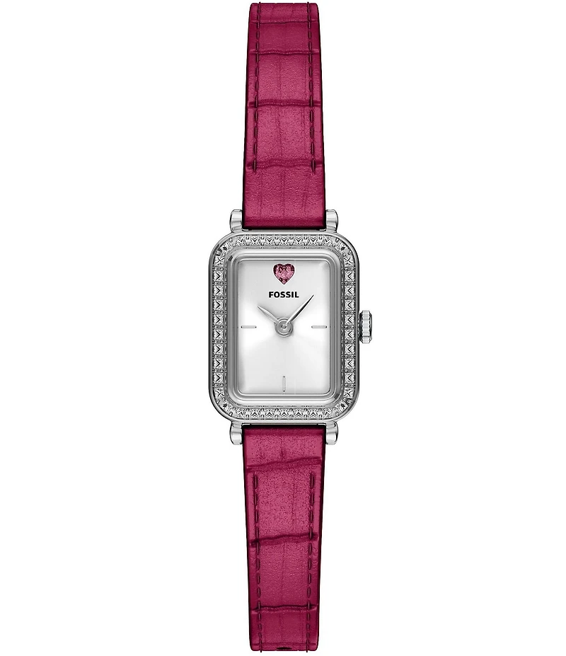 From Fossil, this women's watch features: Leather strap Stainless steel case Satin dial Single prong buckle closure Quartz three-hand movement Band width approx. 10mm Case size approx. 18mm Case thickness approx. 7mm Inner circumference: 175 /- 5mm Water resistance: 5 ATM 2-year limited warranty Imported.