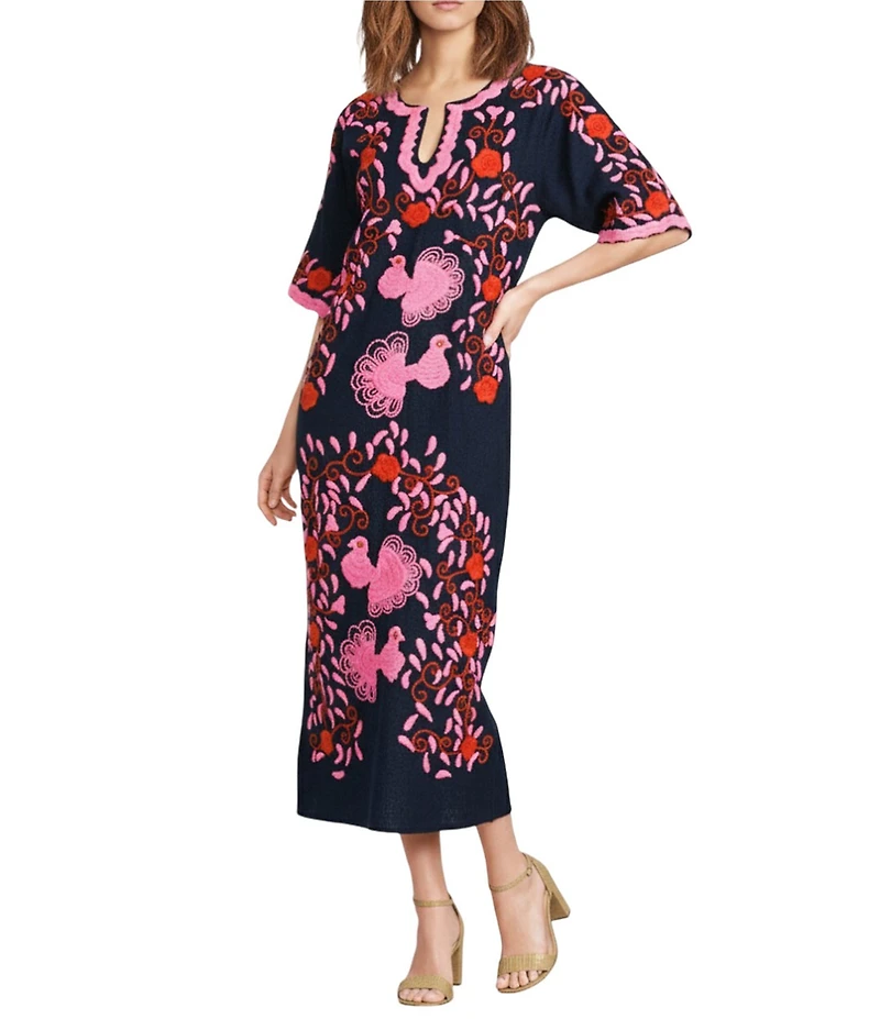 FRANCES VALENTINE Charming Peacock Embroidery Split V-Neck 3/4 Sleeve Caftan Maxi Dress in Franklin, TN