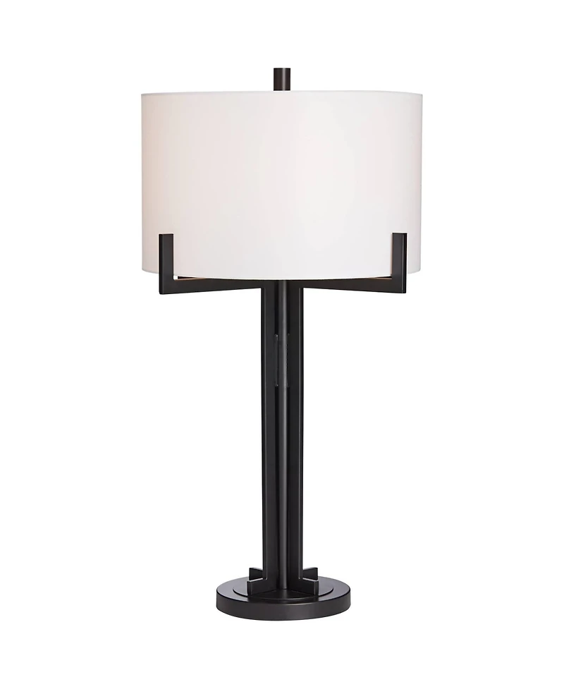 Add an elegant piece of decor to your living space with this industrial modern table lamp from Franklin Iron Works. It comes in a black finish metal frame with geometric sensibilities, which supports a white drum shade on top that provides a beautiful contrast. Perfect for living rooms, bedrooms, and more. Tabletop dimmer included.