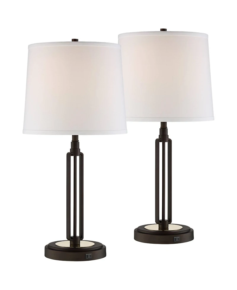 Add this lovely set of two metal table lamps next to a sitting or reading area for an extra source of lighting and style. From the Franklin Iron Works lighting brand, the lamps each have built-in Isb ports in the bases. The Usb ports allow you to easily plug in your phone to charge it efficiently. The slender profile columns are in a bronze metal finish, and the lamps are topped with white tapered drum shades.