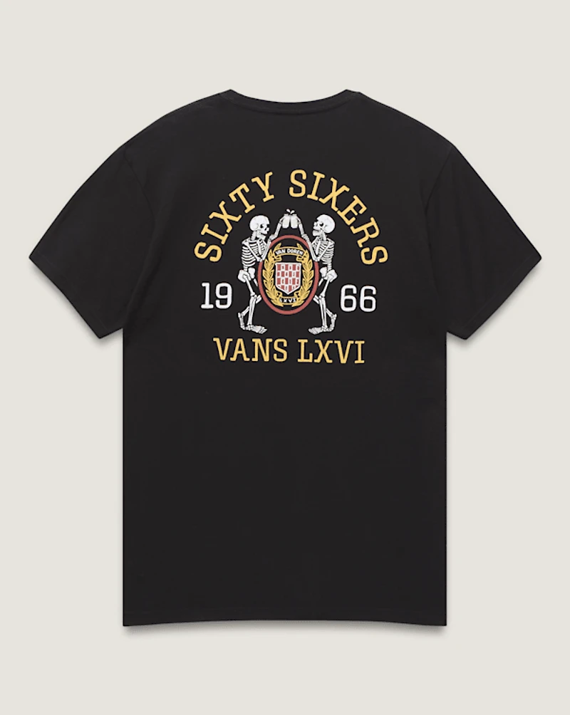 Raise your glass to 1966 in the Frat LXVI Skull T-Shirt, a classic fit short sleeve crew neck T-shirt with a screenprinted graphic of the Vans® origin date on the front, and the same on the back accented with skeletons toasting brews over a collegiate shield.