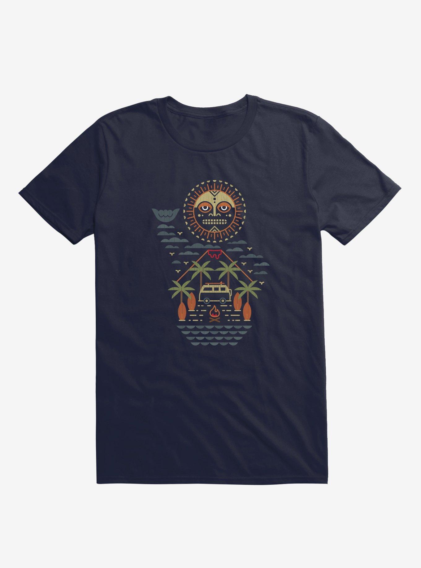 Hang loose. This island-ready lightweight navy blue tee features the image of a friendly tiki made from the sun, clouds, a volcano, palm trees, sand, a surfboard-topped van, and waves. Aloha! Officially licensed art from Cody Weiler.