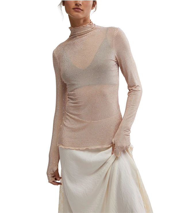 Free People Dance All Night Sheer Embellished Mesh Mock Neck Long Sleeve Fitted Top