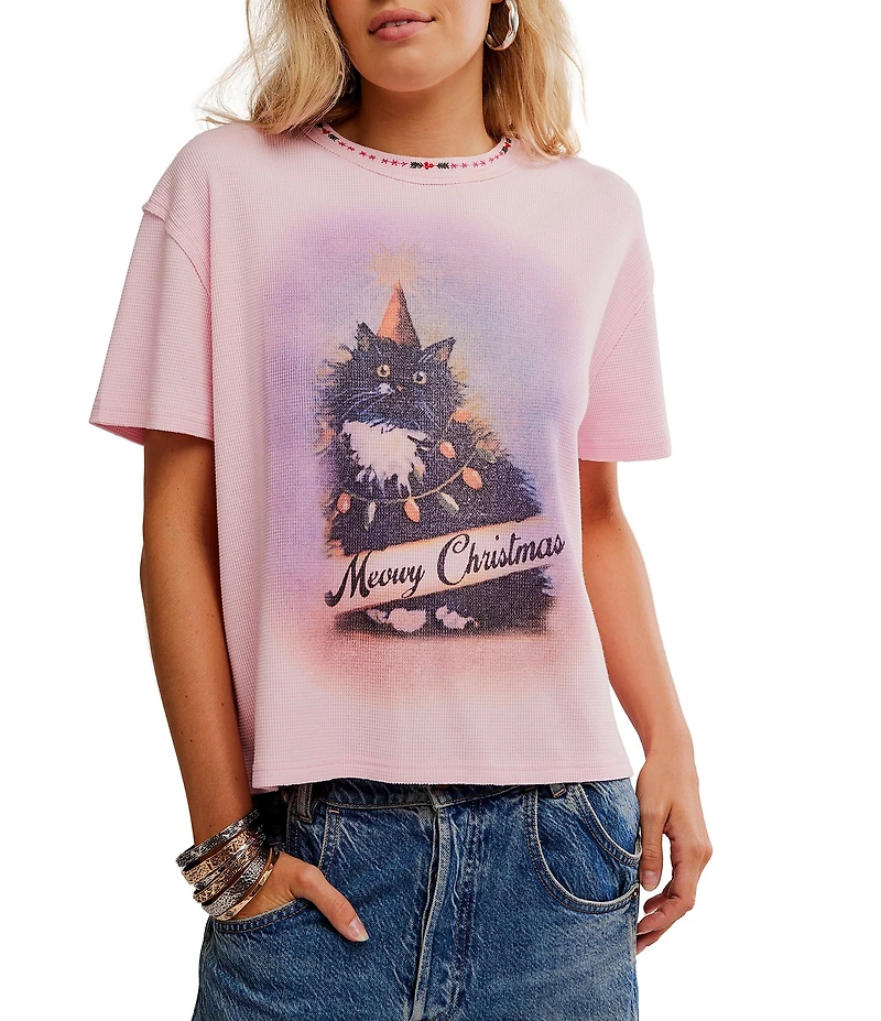 Free People Merry Meowy Christmas Scoop Neck Short Sleeve Kitten Graphic Tee